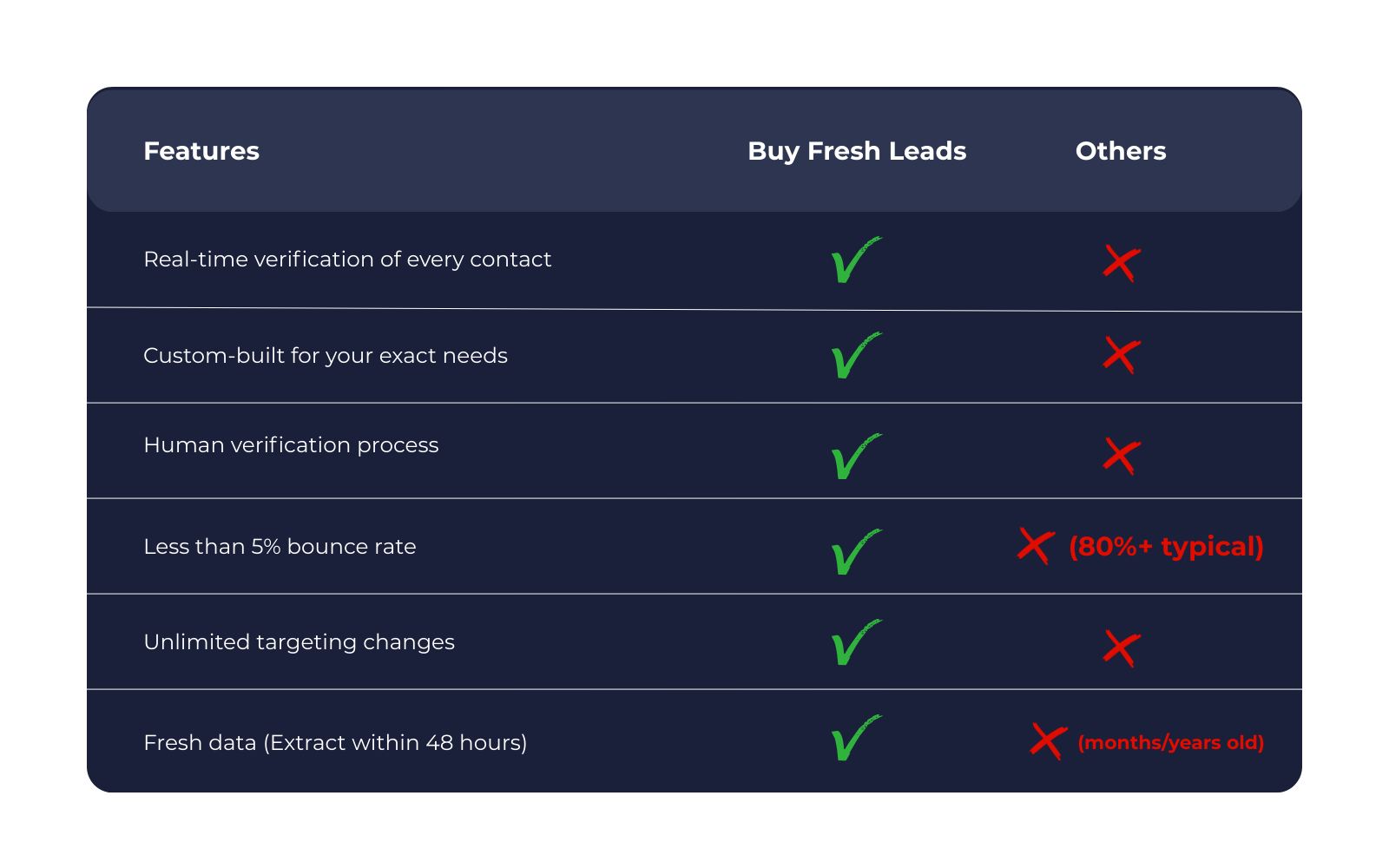 See how Buy Fresh Leads compares to traditional database sellers and AI software